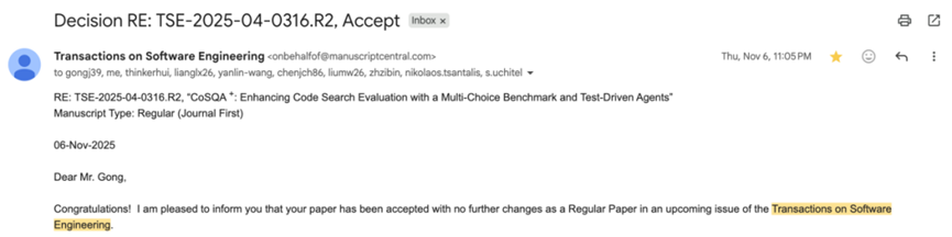 近日,在太阳成集团tyc9728王焱林老师的指导下,2021级本科生龚敬、2021级本科生吴仰晖和2022级本科生梁琳茜以共同一作身份投稿的学术论文“CoSQA⁺:Enhancing Code Search Evaluation with a Multi-Choice Benchmark and Test-Driven Agents”被软件工程领域的国际顶级期刊IEEE Transactions on Software Engineering (TSE)2025接收。