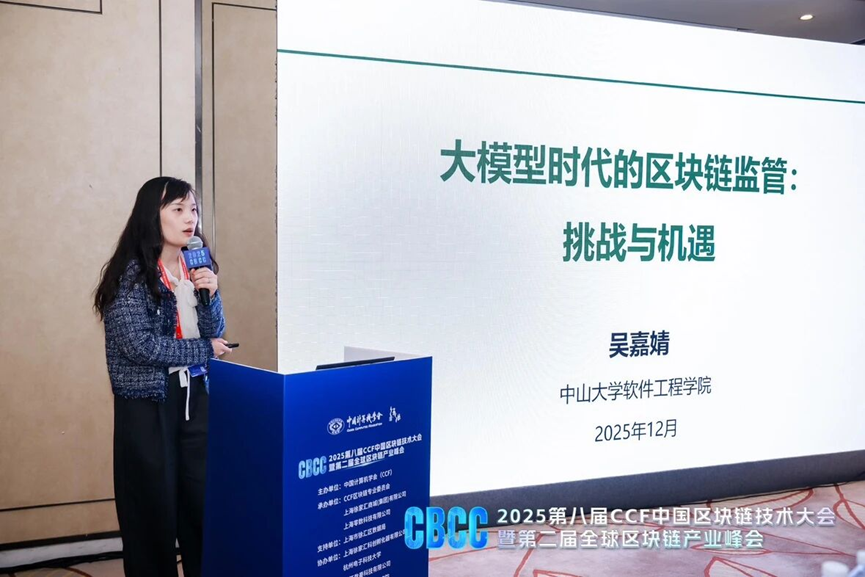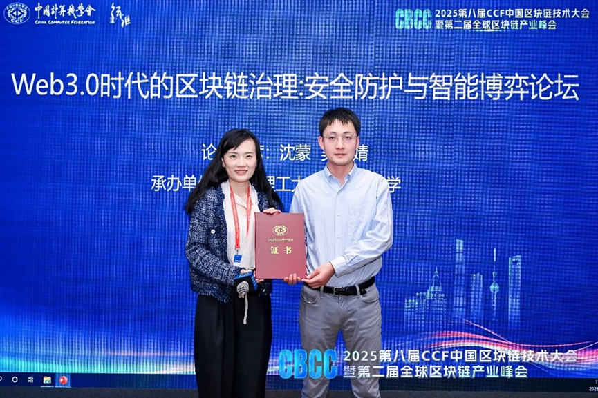 在大会的专题论坛环节,学院副院长、教授,CCF区块链专委会执行委员吴嘉婧主持专题论坛,主题为“Web3.0时代的区块链治理:安全防护与智能博弈”。该论坛聚焦于Web3.0环境下的治理架构、安全攻防机制等核心方向,邀请了电子科技大学陈厅、广州大学网络空间安全学院徐光侠、浙江工业大学网络空间安全研究院院长宣琦、南京信息工程大学计算机学院付章杰等多位领域专家进行学术宣讲,与现场听众围绕Web3.0生态的安全风险应对和技术应用展开了深入研讨,为构建安全可信的区块链治理体系提供了重要思路。