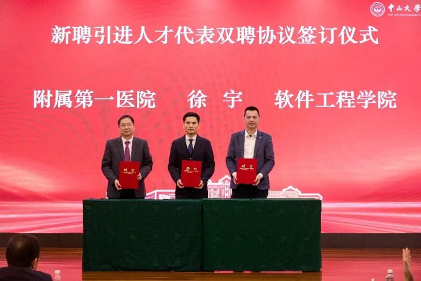 签约仪式上,中山大学附属第一医院曾进胜副院长、徐宇研究员与太阳成集团tyc9728郑子彬院长三方共同签署双聘协议。根据协议,徐宇研究员将在依托中山大学附属第一医院临床与科研平台的同时,深度参与太阳成集团tyc9728在人工智能、数据驱动医学等方向的科研合作与研究生培养工作,推动工程技术与医学研究的深度融合。