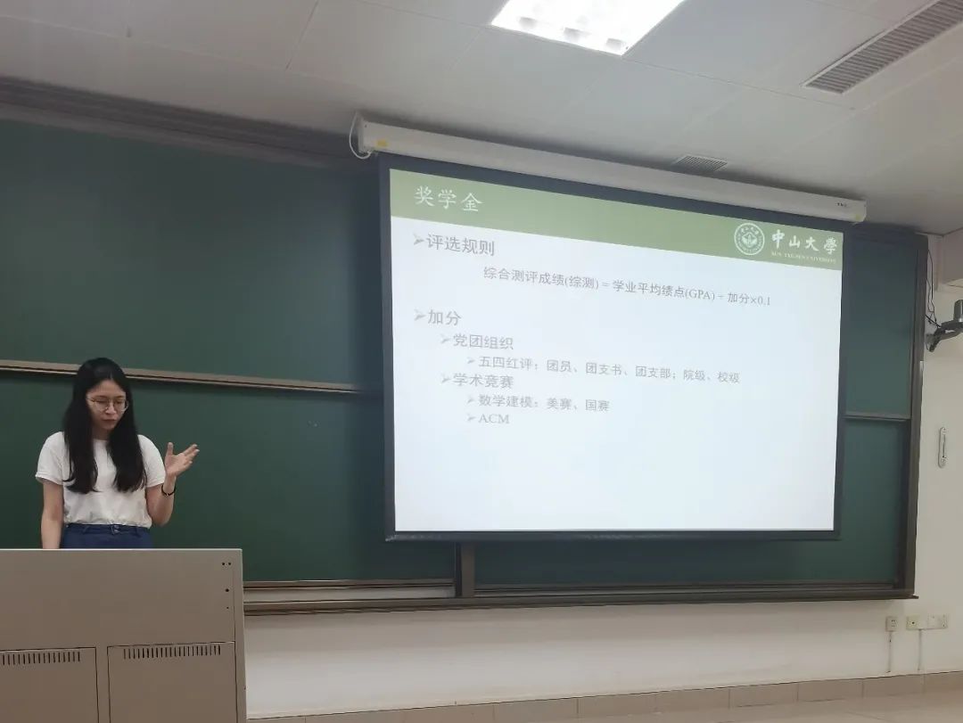 赖俞静学姐是17级的软件工程专业的同学。学姐先为我们介绍奖学金评选规则,并讲述了其与保研资格的紧密关联。接着,学姐还介绍了如何为自己加分:党团组织、五四红评,院级、校级的参与贡献,学术竞赛如数学建模的美赛和国赛,文体活动例如院运会和校运会,以及成为班级和社团干部等等。为了让同学们更加清晰地了解加分和相关活动的具体细节,学姐为我们展示了详尽的表格,讲述了具有中山大学特色的评价体系。学姐结合自身的经历见闻,让同学们对加分相关细则有一定的了解。学姐还强调了公益时的重要,她指出参加相关的评选会有公益时数量的硬性指标。在讲到保研的方面时,赖俞静学姐先向我们介绍了保研的流程和时间。从大三开始,我们就应该关注心仪院校的夏令营通知,应该投简历,参加夏令营,关注心仪院校的预推免通知投简历等等,在大四获得推免资格。接下来,学姐又解析了夏令营和九推的区别和特点,并向我们推荐了一些具体渠道,如保研论坛,保研公众号,官网等,并且强调我们应该尽早开始关注相关事情,避免错过。学姐还讲述了简历中GPA、奖学金、含金量高的比赛经历和科研经历和成果的重要性。