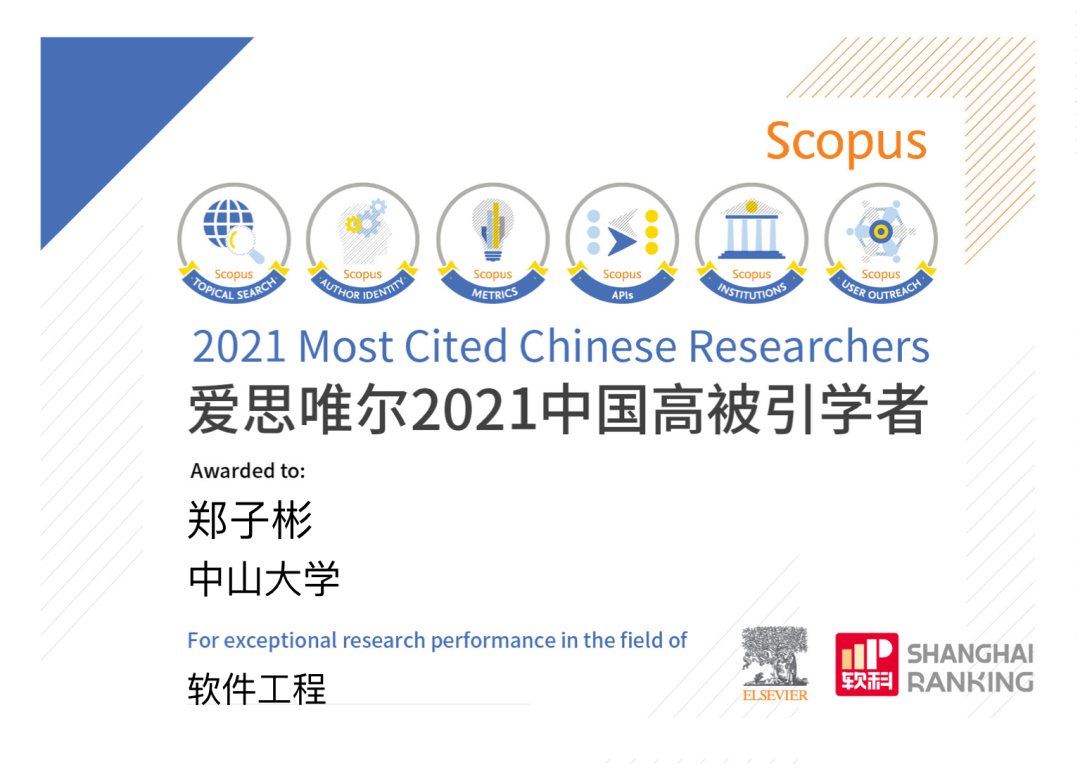 4月14日,爱思唯尔(ELSEVIER)正式发布了2021年“中国高被引学者”(Highly Cited Chinese Researchers)榜单,我院郑子彬教授再次入选软件工程学科“中国高被引学者”,连续两年上榜。