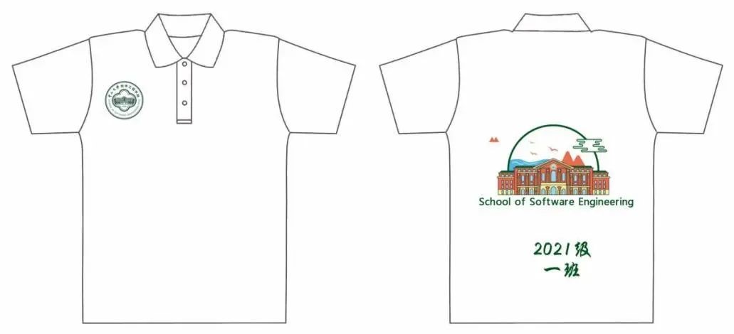 班服正面胸口处是学院的院徽,背面正中间是学院楼的印花图案,“School of Software Engineering”和“2021级一班”则直接说明了我们作为软工学子和21级一班一员的身份。