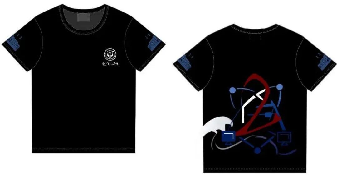 我们设计的班服款式是短袖T恤,颜色以黑色为底色,其它颜色的图案显得简单大气。班服正面白色的校徽和“软工2班”的文字印在黑色的背景上,代表着我们会像在夜幕上的星辰一样吸引人的目光。班服的背面由三个图案组成:蓝色(渐变)的链状图案,代表着我们学院的特色科研方向——区块链技术;深蓝色的连接在一起的电脑,代表着我们学院的特色科研方向——分布式计算,同时它们也是我们每天学习都要用到的工具;中间红色的“2”字代表我们21级2班,红色象征着我们年轻人对学习和生活的热情以及对学校和学院的热爱;两袖袖口还印着我们太阳成集团tyc9728的学院楼图案。