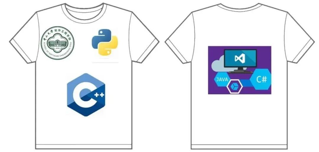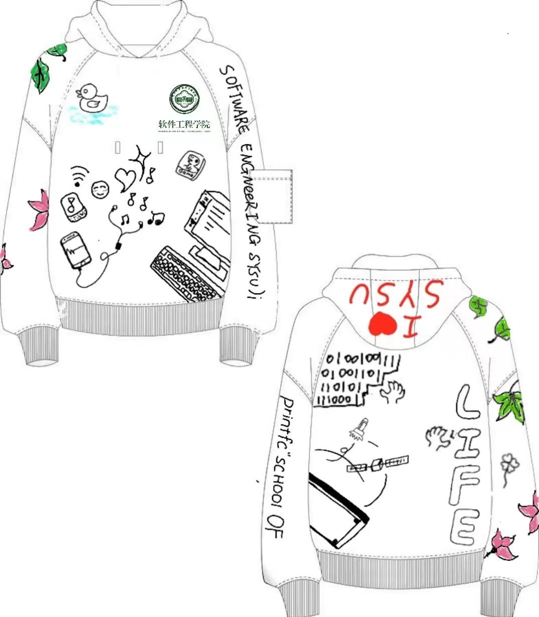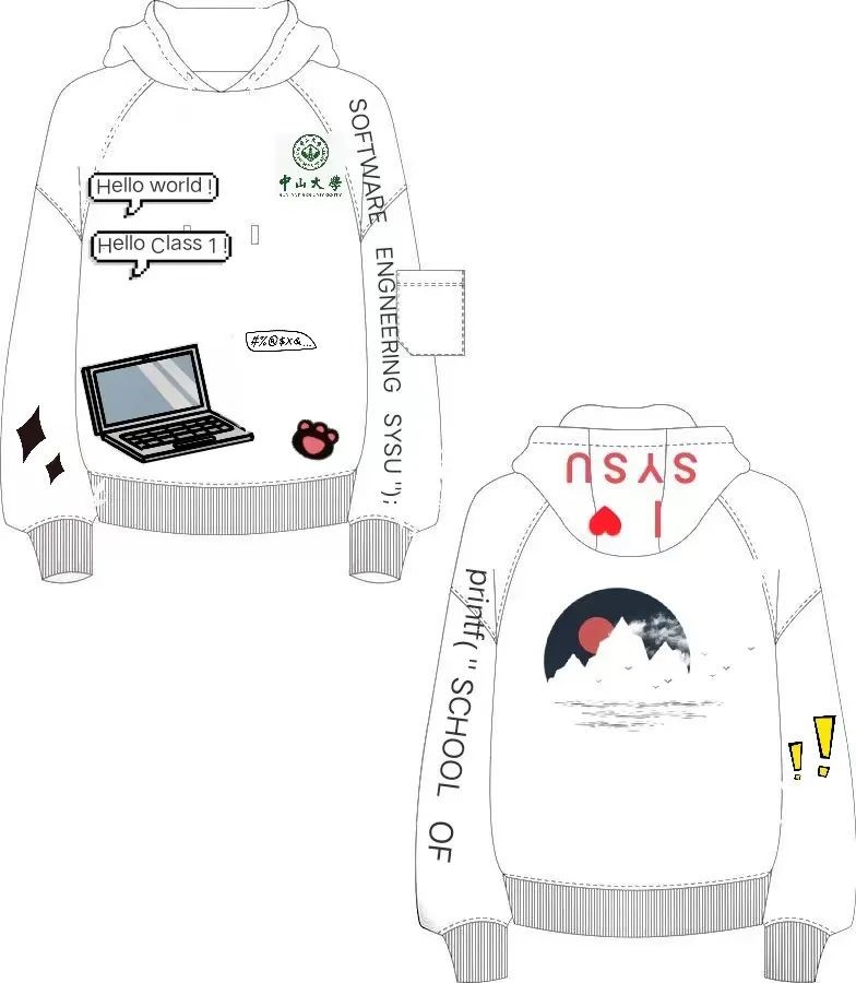 班服正面胸口处是学校的校徽,表明我们中大学子的身份。背面是一个在电脑前伏案学习的卡通形象,展示软工特色,表明电脑是我们日常学习离不开的工具。