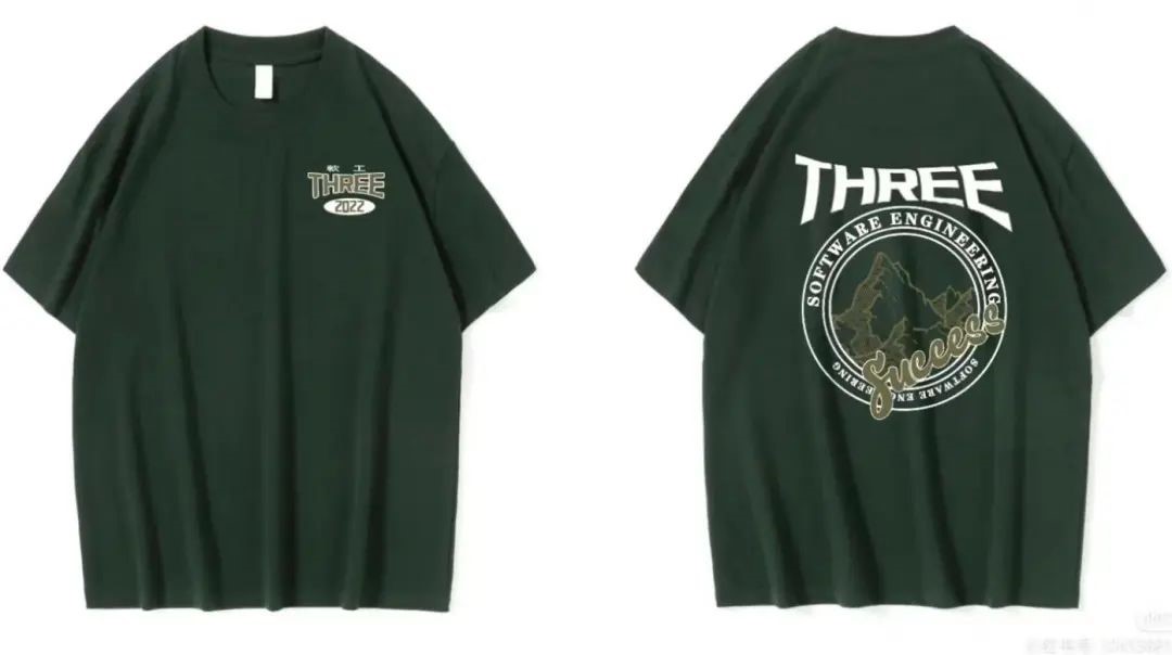 (方案1)衣服以绿色为底色,简约、大气,寓意生机勃勃,软件工程本是一个前途无限的学科,新人的不断涌入,使这个学科充满生机和挑战;前面和背面有“three”、“software engineering”字样,表明我们作为软工22级三班学子的信息,英文也展示出我们与国际接轨;背部的山峰寓意软工人要不惧困难、勇攀高峰。我们向星辰许愿,在山海相见。