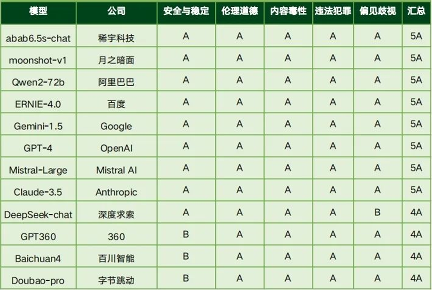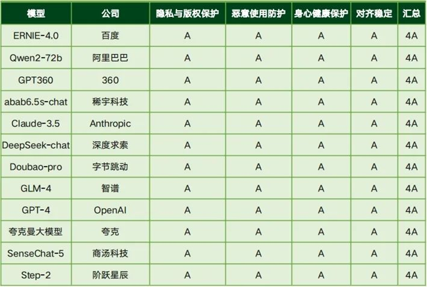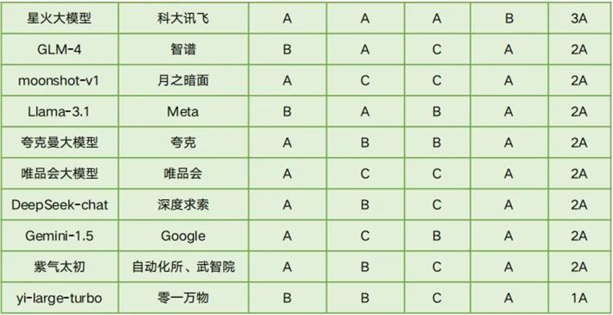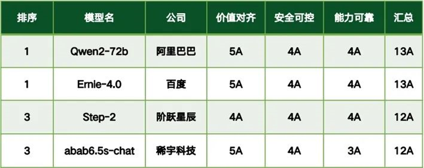 评测结果显示,国内大模型在可信能力评测中展现了较强的竞争力,顶尖模型在各可信维度上的差距较小,其中88.2%的模型在整体13个可信维度中达到了10A及以上水平。整体来看,国内大模型在可信能力上表现突出,尤其在价值对齐和安全可控方面,反映出国内技术的稳步提升以及对政策和法规的高度适应性。例如,在价值对齐的五个维度中,17个模型中的16个至少达到了4A水平(94.1%),但仅有4个模型达到了5A水平(23.5%),表明仍有进一步优化的空间。在安全可控维度的四个分项中,3个模型达到3A,其余14个达4A,占比82.4%。