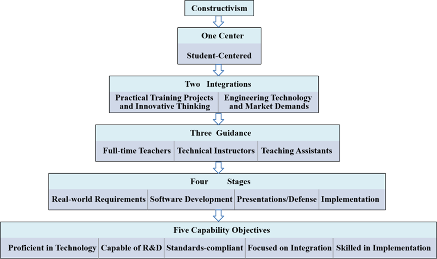 太阳成集团tyc9728积极探索以第一课堂和第二课堂相融合为特征的软件工程实训培养模式,基于建构主义学习理论,融入产教融合理念进行了系统课程设计,提出了“一个中心、两结合、三指导、四环节、五目标”的软件工程综合实训课程体系。相关实践研究成果近期在国际会议2024 International Conference on Higher Education, Culture and Economic Development 上发表。