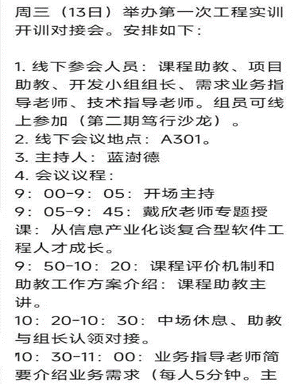 在开发过程方面,课程分别在需求分析、原型设计和开发阶段安排一次大组会,参与人员包括业务指导老师、项目助教、项目小组成员以及上一期项目团队代表。每个阶段的大组会旨在确保项目顺利推进,融入产教要素,通过与现实应用需求的对接,帮助学生理解实际应用场景和需求。
