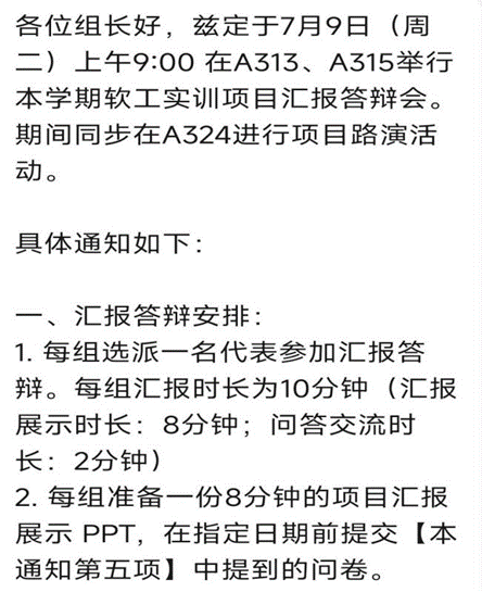 通过项目答辩和路演,学生可以展示相应的实践成果,获得学术和行业专家反馈。项目答辩前,各开发小组提交项目交付答辩PPT、路演海报、组内互评成绩和助教评分。每组需派出代表进行8分钟的项目展示和2分钟的现场问答,展示内容包括项目功能介绍、亮点功能以及小组成员的分工安排,全景化展示项目的实际应用场景及工程思维成果。答辩结束后,各小组将项目代码上传至学院代码管理平台。