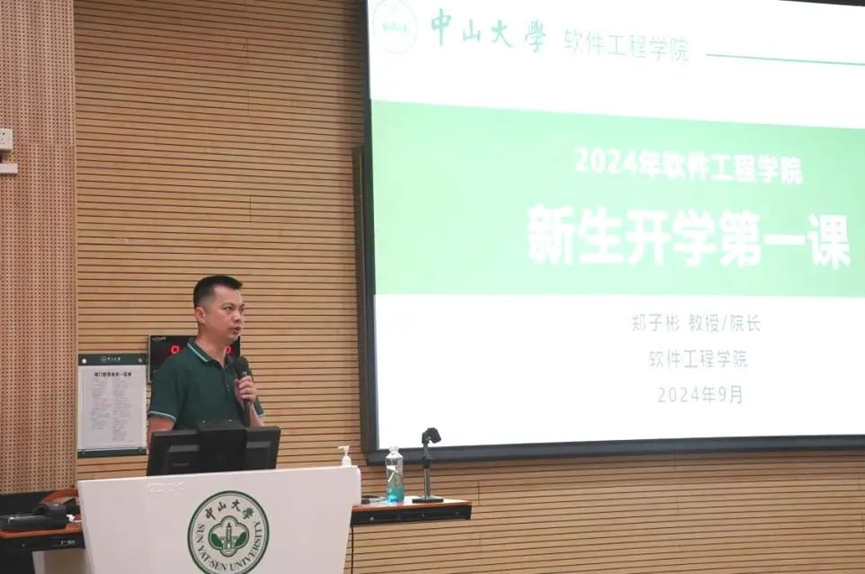 院长郑子彬教授围绕学院办学历程、学科情况、师资力量、科研平台和学术成果等方面详尽向新生介绍了学院整体情况,重点介绍了学院人才培养模式和本科生培养成效。他指出学院会为每一位入读软工的同学提供个人成长发展的机会与平台,鼓励新生早进实验室早进课题组,在课余多参加第二课堂、大学生创新创业训练计划项目、学科竞赛等自主性强的活动,争取“德智体美劳”全方位发展。同时,郑院长希望新生能积极融入“高效沟通、平等透明、说话算话、快速成长”的学院文化,培养实践能力、科学素养和创新精神。