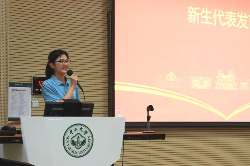学院2024级本科新生代表黄昱萌同学通过回顾自己入学来在中大所看到的葳蕤草木与红墙绿瓦,以及军训期间同学们互帮互助的一桩桩小事,表达了对中大优美校园风光的欣赏和对学校学院所给予的人文关怀的感谢。她表示作为“世纪华诞级”新生,将与各位同学共勉,践行校训精神,传承使命,敢于担当,在未来培养“两种态度”和“两种能力”,用行动谱写这一代中大人的新华章。