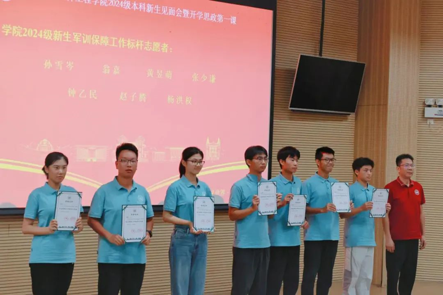 为弘扬先进、树立典型,调动同学们传递正能量与爱心的积极性,学院广泛征集2024级本科新生的建议,由同学们民主提名,推选出了在军训期间默默为大家服务的一批志愿者。借举行新生见面会的机会,学院党委陈征宇书记为军训保障工作标杆志愿者们颁发了荣誉证书,希望同学们能继续相互扶持,相互鼓励,共同进步,多为班级、学院和学校做实事。