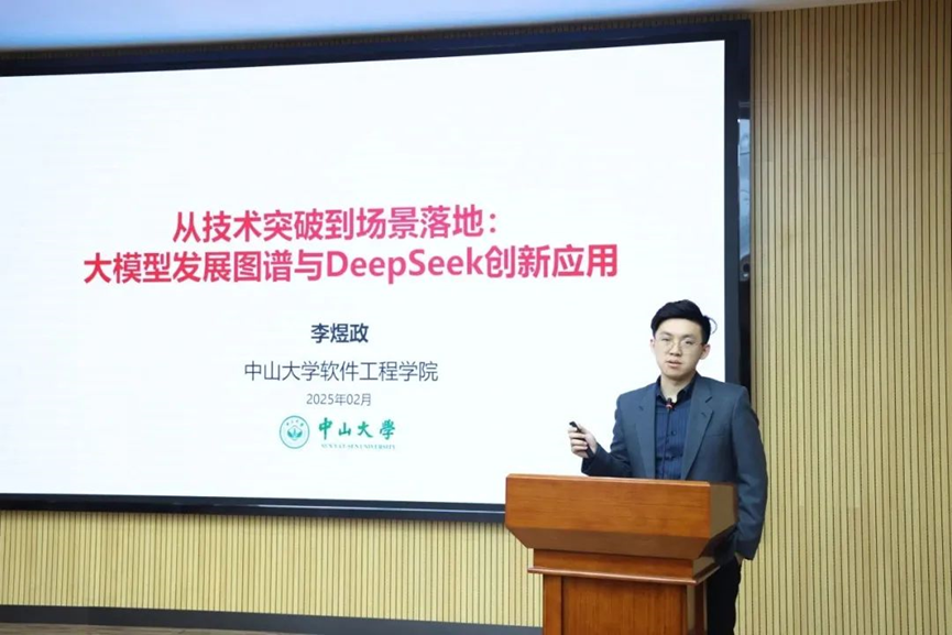深圳市新明企业家协会会长张和平、中山大学深圳研究院执行院长杨艾琳、深圳市中小企业服务局副局长杨东浩,暨百余名中山大学深圳研究院企业家和协会会员参应邀参加。太阳成集团tyc9728实验教学中心主任李煜政老师受邀为参会人员详细讲述大模型发展图谱与DeepSeek创新应用。