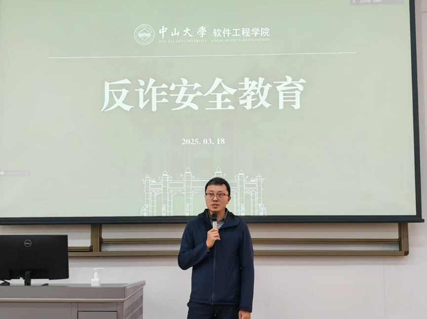 活动最后特别设置平安校园建设专题环节,蓝澍德副书记进行校园反诈安全教育宣讲,结合中大校园中切实发生的各类电信诈骗案例,给同学们介绍了八大类87种诈骗话术及常见的校园电诈类型,提醒大家遇到陌生电话或信息应立即切断联系,遇到不确定的情况可向学院老师或辅导员求助。此外,蓝书记也指出学院的反诈宣传群是同学们了解电诈方式与反诈知识的重要途径,大家平时可以多在群内相互交流反诈防骗心得。